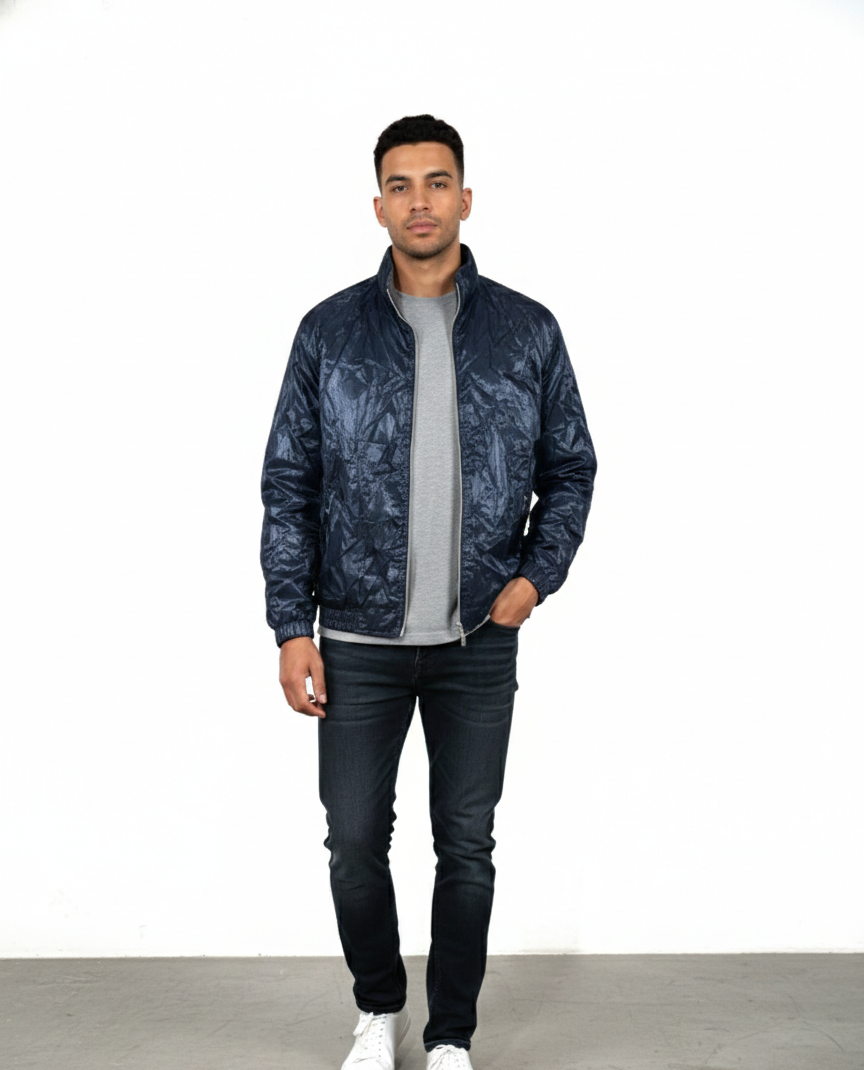 Upgrade your everyday style with this Blue Printed Stand Collar Jacket, designed for a clean, modern look with a touch of texture. The deep blue shade with subtle printed pattern gives it a premium streetwear feel that pairs easily with jeans and casual outfits.