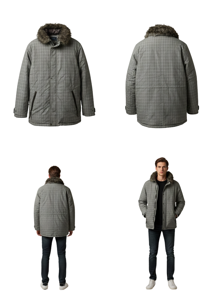 A long-length winter overcoat with fur hood, built for warmth, comfort, and premium winter style.