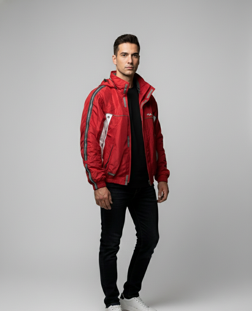 A lightweight red & white windbreaker jacket designed for everyday comfort with a sporty, modern look.